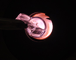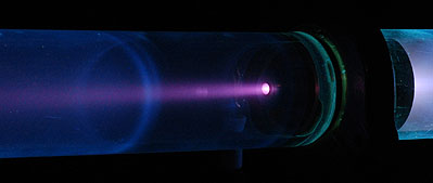 einigen Hundert Volt in eine röhrchenförmige Kathode beschleunigt.