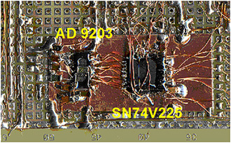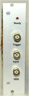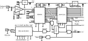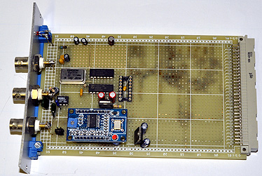 Die Elektronik auf der Karte bringt es auf 30 Megasamples bei einer Speichertiefe von 1024 Byte. Im Wesentlichen besteht die Schaltung aus einem schnellen AD-Wandler und einem Fifospeicher. Da das Fifo schon den erforderlichen Adresszähler enthält gestaltet sich der Aufbau sehr einfach und es werden nur noch wenige externe Bauteile benötigt. Der Sampletakt wird vom DDS-Baustein bereit gestellt. Leider gibt es den verwendeten AD-Wandler (AD 9203) und das Fifo (SN74V225) nur im kleinen SMD-Gehäuse. Deswegen wurde die Schaltung frei verdrahtet auf ein Stück Leiterplatte aufgebaut und nach dem Test mit UHU-Puls Kleber vergossen um die feinen Lötstellen zu schützen. Der DDS-Generator ist ein fertiges Modul mit dem AD 9850 von AnalogDevice das mit einem 125 MHz Oszillator eine Taktrate bis 40 MHz erzeugen kann. Das Ausgangssignal des DDS steht auch an einer BNC-Buchse für andere Verwendungen zur Verfügung. |