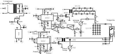 Das Netzgerät wurde für eine Spannung von 50 kV bei einem Röhrenstrom von 100 µA ausgelegt. Diese Werte sind mehr als genug um ausreichend hohe Zählraten zu erhalten. Bei dieser niedrigen Röhrenleistung von maximalen 5 Watt kann auch auf eine Zwangskühlung der Röhre verzichtet werden. Zur Erzeugung der Hochspannung wird ein Impulsbreiten gesteuertes Schaltnetzteil verwendet. Die Impulsspannung des Steuer-ICs SG 3525 wird wird mit einem MOS-Fet verstärkt, mit einem modifiziertem Zeilentrafo hochspannt und mit einer 8-fach Greinacherschaltung gleichgerichtet und vervielfacht. Die erzeugte Hochspannung wird mit einem 1 GOhm Widerstand geteilt, und mit einer einstellbaren Referenzspannung verglichen. Die so erzeugte Regelspannung wird verstärkt um dem Steuer-IC zugeführt. Der Strom durch den 1 GOhm Widerständ fliesst auch durch durch das Messgerät (100µA ~ 100 Kv) zur Anzeige der Spannung. Die Welligkeit der Hochspannung wird durch ein Siebglied 1 MOhm und 1nF (60kV) verringert. |