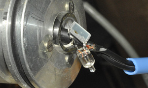 Das Kanalröhrchen mit 1,5 mm Durchmesser sitzt in einem T-Flansch dessen