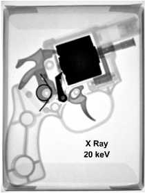 von 50 kV mit Kupferfilter nur die wenigen Metallteile des Revolvers