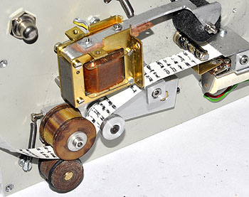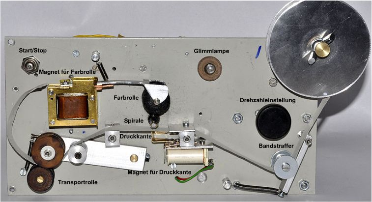eine Messingachse gezogen wurde. Unter dem Papierband ist das Drucksystem zu