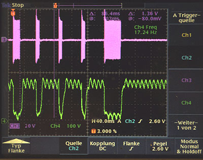 am Druckmagnet, grüne Kurve. Auffallig ist der mit 50V große 50Hz Ripple.
