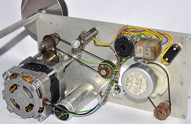 Der Synchronmotor unten im Bild links, zum Spindelantrieb hat eine Drehtahl von
