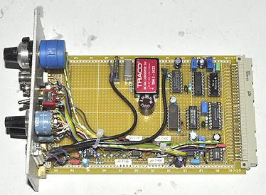 Auf die Verstärkerstufen folgt ein Komparator dessen Ausgangssignal über ein Flipflop die Sample&Hold-Stufe triggert. Das Ausgangssignal der SH-Stufe wird dem AD-Wandler zugeführt. Auf der Platine befindet sich noch ein DC-DC-Wandler der die Biasspannung (max. 45V) für Halbleiterdetektoren bereit stellt. |