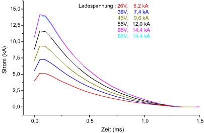 die Railgun dar der etwa 21 kA erreicht. Die Halbwertszeit des Pulses beträgt
