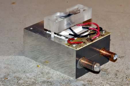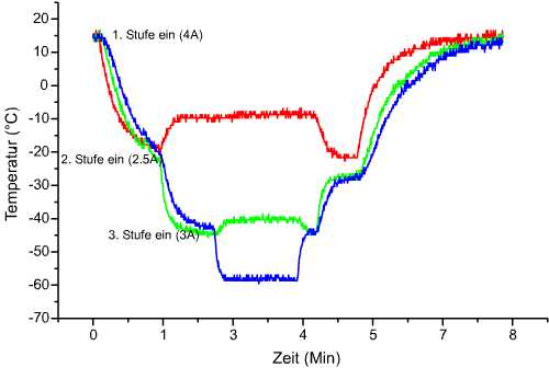 | Tiefere Temperaturen erhält man mit einer thermischen Reihenschaltung mehrer Peltierelemente. Da der Wirkungsgrad wie erwähnt ziemlich niedrig ist sollte die Kühlleistung der einzelnen Elemente zur warmen Seite hin zunehmen. Im folgenden wird ein Stack aus drei Elemente gezeigt. Das größte hat eine Kantenlänge von 40 mm, das mittlere 30 mm und das kleine 15 mm. Der Stack sitzt auf einem Wasser gekühlten Alublock. Alle drei Elemente werden aus verschiedenen Netzteilen betrieben um den jeweils optimalen Strom einstellen zu können. | ||||||||