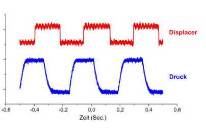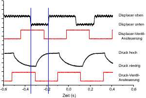 Position des Displacers, die dritte Kurve den Verlauf des Drucks.