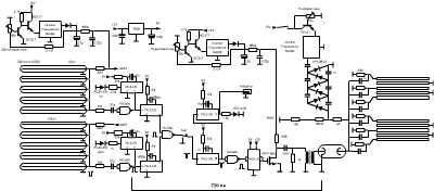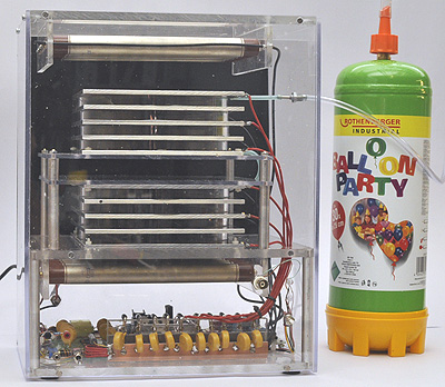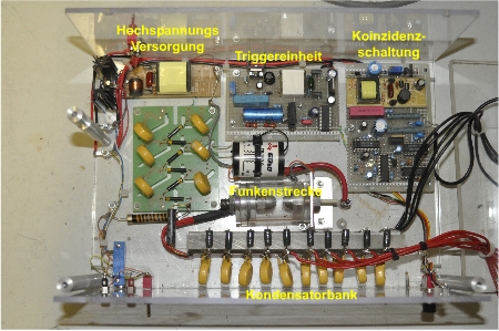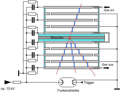 | Die Kammer wird von zwei Zählrohrbänken getriggert. Fünf Zählrohre des Typs Si22G befinden sich über der Kammer und fünf darunter. Eine Koinzidenzschaltung wertet die Signale der Zählrohre aus. Löst ein Teilchen in beiden Zählrohr-Bänken gleichzeitig ein Signal aus wird die Funkenstrecke gezündet und damit die Hochspannung an die Kammer gelegt. | |||||||||||||
