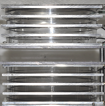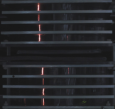 | Aufbau: Im Gegensatz zur >anderen Kammer< wurde diese so gebaut das sich die Ecken und Kanten der Elektroden nicht im gasgefülltem Entladevolumen befinden. So können die lästigen Nebenentladungen ziemlich sicher verhindert werden. So besteht die Kammer aus Aluplatten (150 x150 mm) die durch 8 mm hohe Plexiglasringe von einander getrennt sind. Die Ringe wurden von einem Rohr 150 x 5 mm abgesägt.Ringe und Platten sind mit UHU-Puls aufeinander geklebt. Durch Bohrungen in den Aluplatten kann das Kammergas zugeführt werden. Es wurden zwei Module mit jeweils 5 Platten aufgebaut. Zwischen den beiden Module kann z.B. eine Bleiplatte eingefügt werden um im unteren Modul Strahlenschauer zu erzeugen. | |||||||||||||