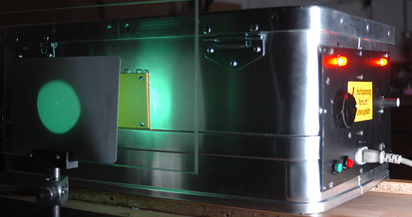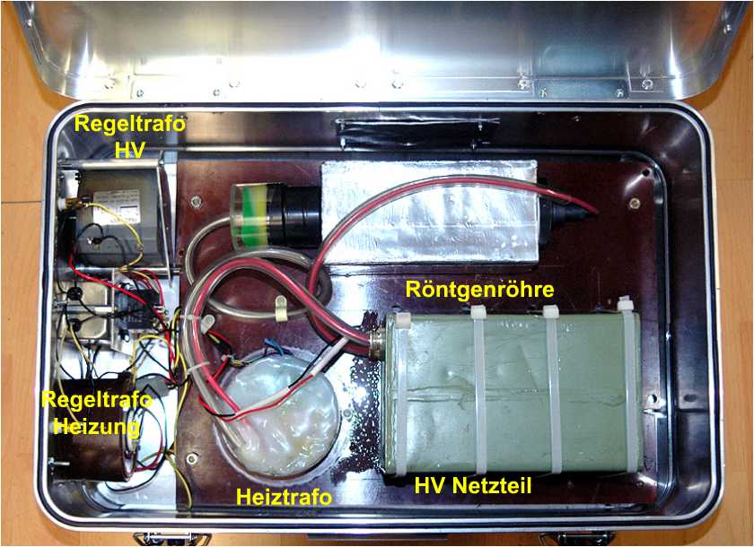 Nachdem es immer wieder Probleme mit Überschlägen und Aufladungen gab, welche sogar das Ableben einer Digitalkamera Nikon D80 zur Folge hatten, wurde der komplette Röntgengenerator in einen Alukoffer eingebaut. Durch die Abschirmung des geerdeten Koffers haben Überschläge im Innern keine Auswirkung auf die Umgebung. |