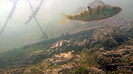 Flussbarsch und den Malermuscheln am Seegrund. |