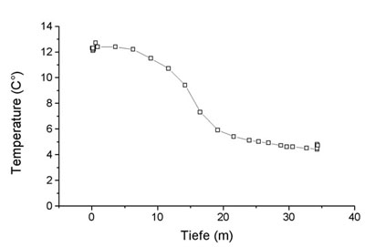 Interessant ist der Verlauf der Wassertemperatur mit der Tiiefe. Das