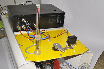 Für die beiden Schwimmkörper wurden PVC-Lüftungsrohre verwendet. Die Rohre wurden mit Spitzen aus Hartschaum und Sperrholz versehen, der Heck kseitige Abschluss ist eine Plexiglasplatte. In jedem Schwimmer befindet sich ein Akkupack (NiMH, 6V 2400mAh). Die Schwimmer wurden mit PU-Schaum ausgefüllt. So können bei Dichtigskeit-Problemen die Schwimmer nicht volllaufen, es bleibt immer ein positiver Auftrieb und das Boot ist unsinkbar, ganz im Gegensatz zum >Vorgänger<. |