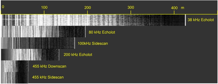ereicht 100 m. Die beiden 455 kHz(Nr. 2, Nr.4) Sonare haben mit