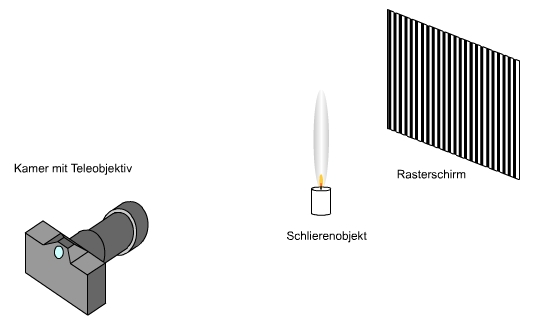 Zur Sichtbarmachung von Schlieren werden zwei Gitter verwendet. Der Strahlengang,