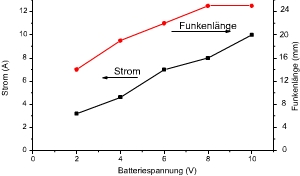 10 V und einem Primärstrom von 10 A wurde gerade Mal eine Funkenlänge