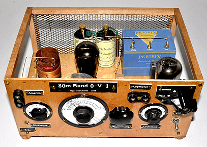 80m Band gelegt.Die Schaltung ist mit zwei RE 074 Röhren bestückt.