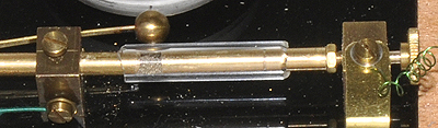| Rechts der Kohärer, zwei Messingstangen