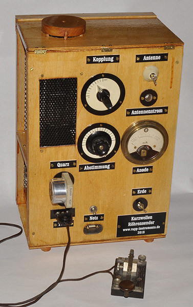 Links der fertige Sender mit einer originalen alten Morsetaste.