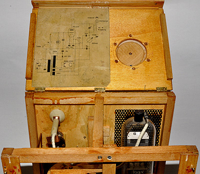 Im Netzteil sieht man links den Netztrafo, daneben die Gleichrichterröhre