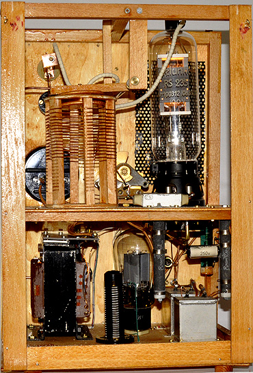 Zwischen Röhre und Spule ist der Drehkondensator zur Abstimmung