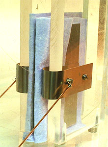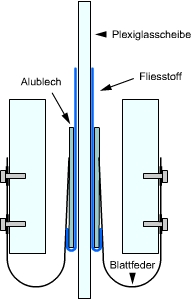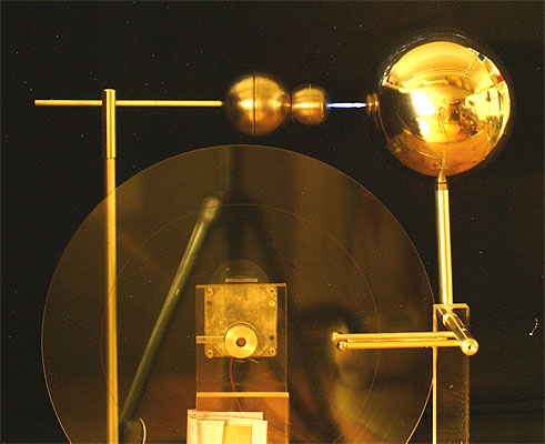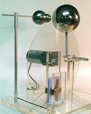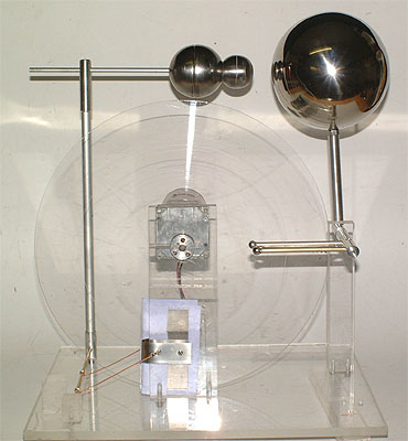 | Aufbau: Statt Glas wurde hier das leichter zu bearbeitende Plexiglas verwendet. Die Plexiglasscheibe hat einen Durchmesser von 35 cm und ist 3 mm dick. Angetrieben wird die Scheibe von einem kräftigen Motor mit Untersetzungsgetriebe. Durch die Reibkissen wird die Umdrehung der Scheibe stark gebremst sodass das Drehmoment des Antriebs deutlich höhers sein muß als bei der Influenzmaschine. Die erzeugte Ladung wird mit zwei Sprühkämmen abgenommen und lädt eine Metallkugel. Zur Erhöhung der gespeicherten Energie kann ein Kondensator (Leidener Flasche) mit der Metallkugel verbunden werden. |