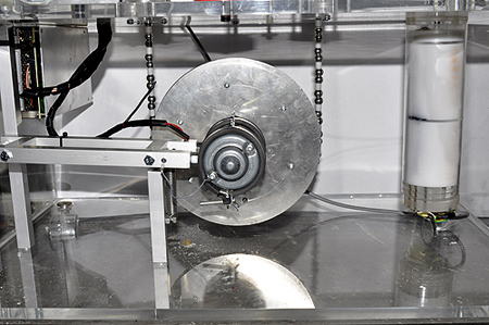 neben dem Antriebsrad sieht man den Hochspannungsgenerator für die Ladespannung.